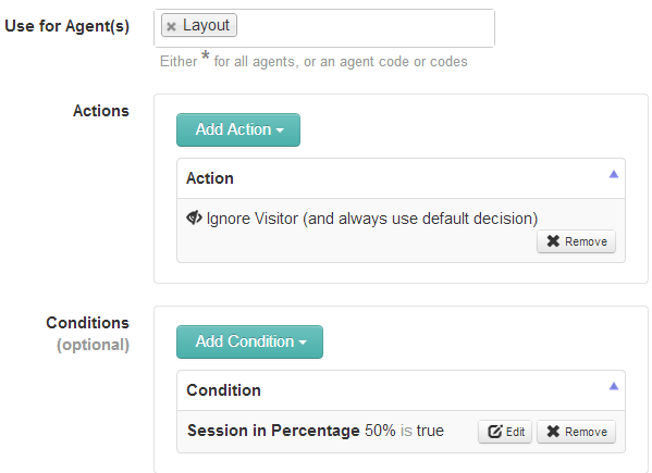 This rule will randomly assign 50% of the site’s visitors into the Layout test. The other 50% will not be assigned to the test (the % can be customized). We now just need to set up a filter for the Offer test, that excludes visitors that have been placed into the Layout test.