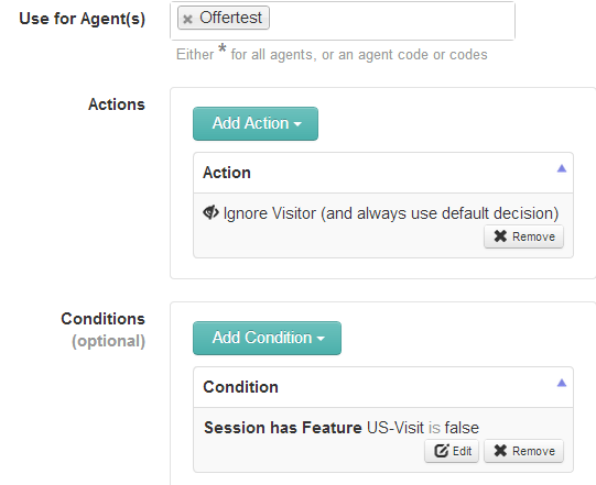 The most obvious reason for managing a test audience, is that some tests may not be appropriate for all users. For example, you might want to include only US visitors for an Offer test that is based on a US only product. That is pretty simple to do with Conductrics. You just set up a rule that filters visitors from the specified test (or tests) if they do not have the US-Visit feature. The set up in the UI looks like this: