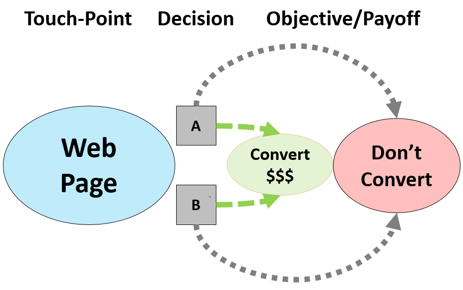 In the image below we have a decision on a web page where we can either present ‘A’ or ‘B’ to the customer, and the customer can either convert or not convert after being exposed to either ‘A’ or ‘B’.