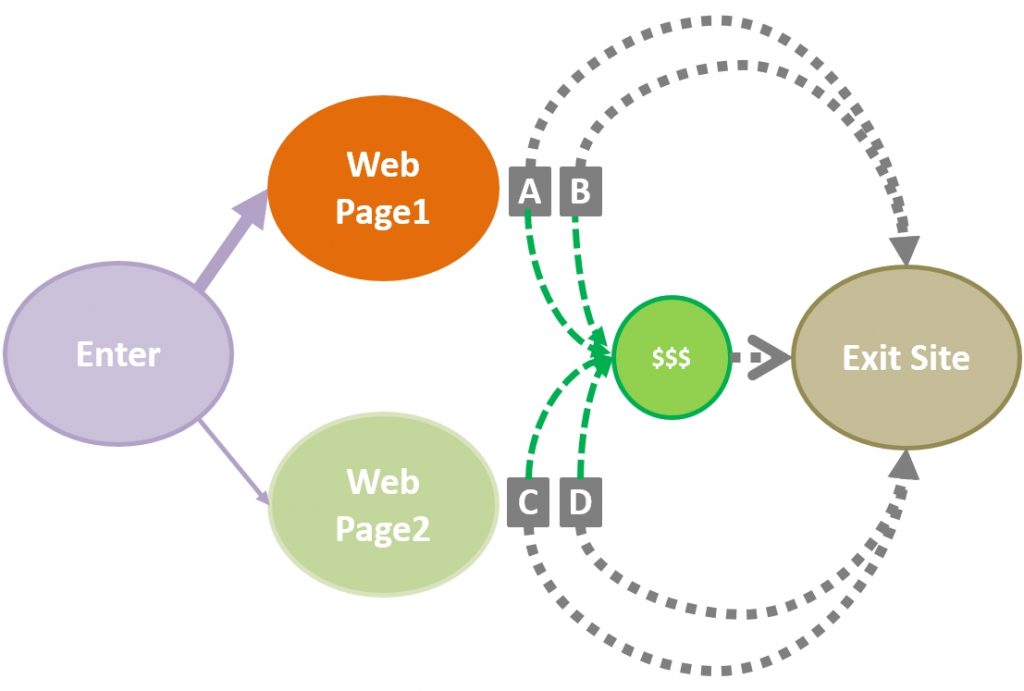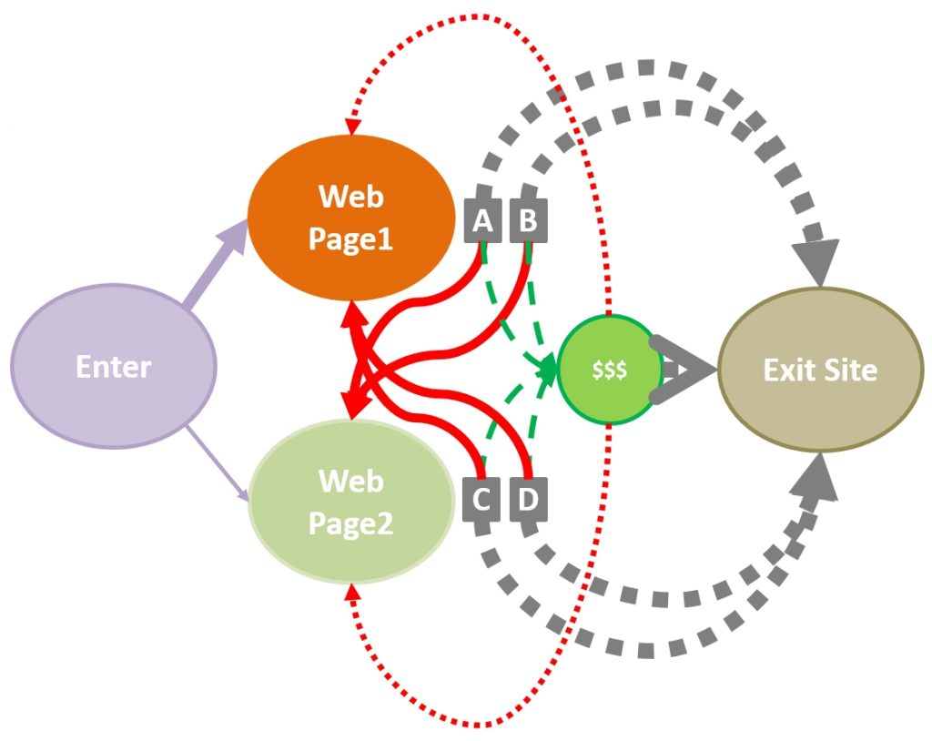 From each of the pages we see that some of the customers will convert (represented by the path through the green circle with ‘$$$’ signs) before exiting the site, while others will directly exit the site without converting (represented by the direct paths to the ‘Exit Site’ node). We could just treat this as two separate AB tests, and just evaluate the conversion from each of our options (‘A’ and ‘B’ on Page 1, and ‘C’ and ‘D’ on Page 2).