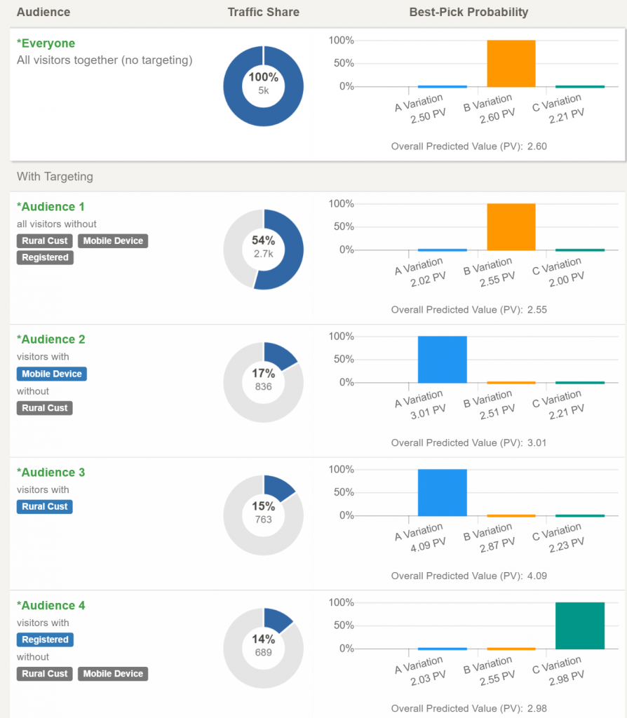It is also useful to see each targeted audience side by side, with additional details, such as audience size, as well as the predicted values of each option and the probability that each option is the best one.