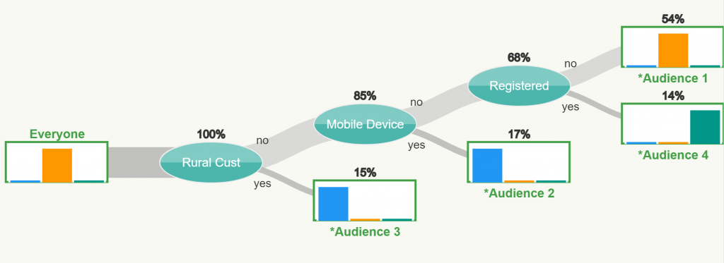 The model begins with everyone in a single group (the Everyone Audience on the far left) – as you would with simple AB testing. Then, one by one, Conductrics finds the user features that are most useful to discriminate between the user experiences (tech note: unlike standard tree algorithms, that build decision rules from the data, Conductrics unpacks a sparse set of rules that are implicitly represented within a predictive model (function approximation)). This is very similar to the game of 20 questions you may have played as a child. Conductrics tries to ‘ask’ the fewest questions possible, while still finding the best solution. In this case, we only need to include three user features: Rural or not; Mobile Device or not; and Registered or not.