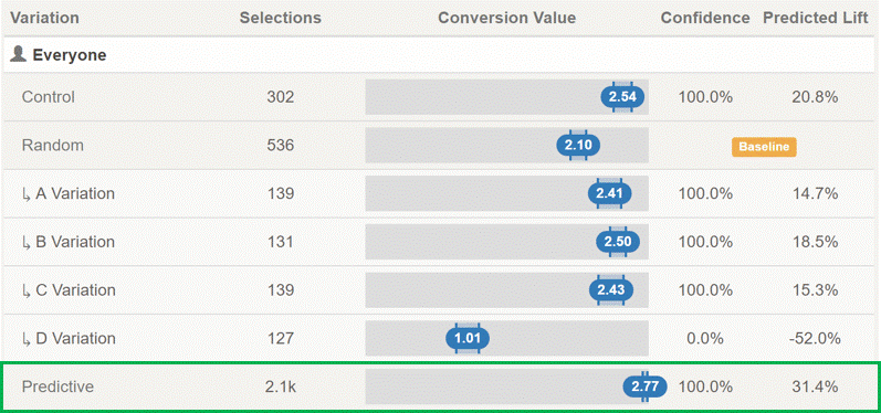 But how do you know if the targeting rules are working? Well, we can evaluate our little targeting program by running a type of AB Test, but where our predictive program is one of our test’s options. By default, Conductrics will take a random sample to use as a baseline to compare against the predictive targeting rules. For example, our targeting program returned about $2.77 per user, whereas a simple random play of the four base options returned just $2.10, for a lift of 31.4%